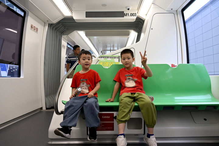 9月21日,在2024世界制造业大会上,小朋友参观体验阿尔斯通跨座式单轨列车。新华社记者 黄博涵 摄