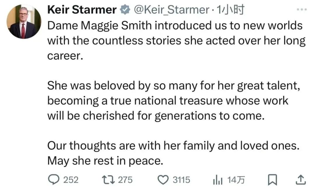 英国首相基尔斯塔默发文缅怀,玛吉史密斯在漫长的演艺生涯中为我们带来了无数精彩的角色,她因伟大的作品受到很多人的喜爱,她是真正的国宝,我们的心与她的家人同在。