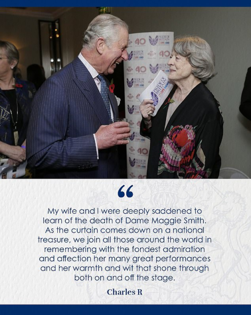 英国国王查尔斯三世发表声明悼念玛吉史密斯并附上合影。图自英媒