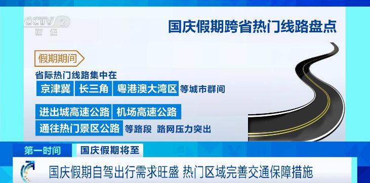 根据研判,今年国庆假期,省际热门线路集中在京津冀、长三角、粤港澳大湾区等城市群间。进出城高速公路、机场高速公路和通往热门景区公路等路段,路网压力突出。
