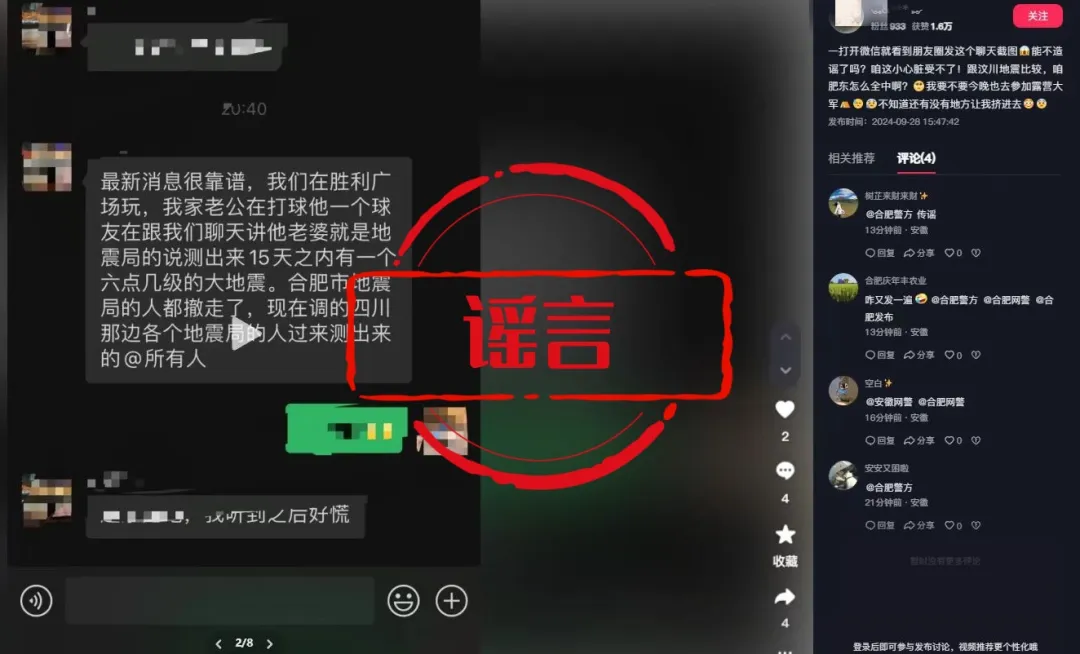 9月19日,郭某通过抖音发布视频,谣称肥东4.7级地震导致6人死亡,引发本地居民恐慌,严重扰乱社会秩序。地震发生后,经排查,无人员伤亡、无房屋倒塌等情况。