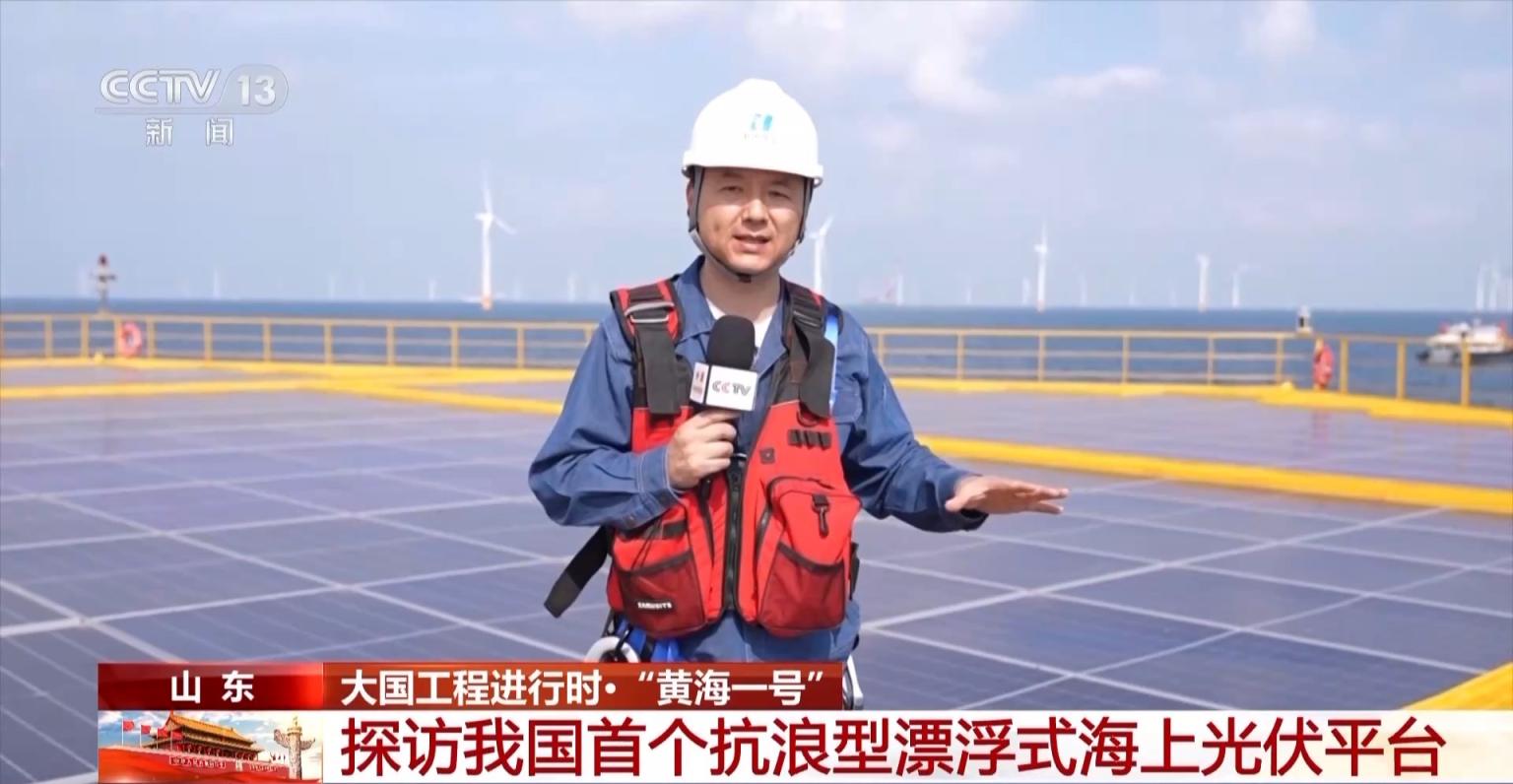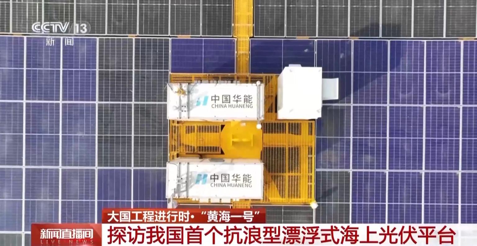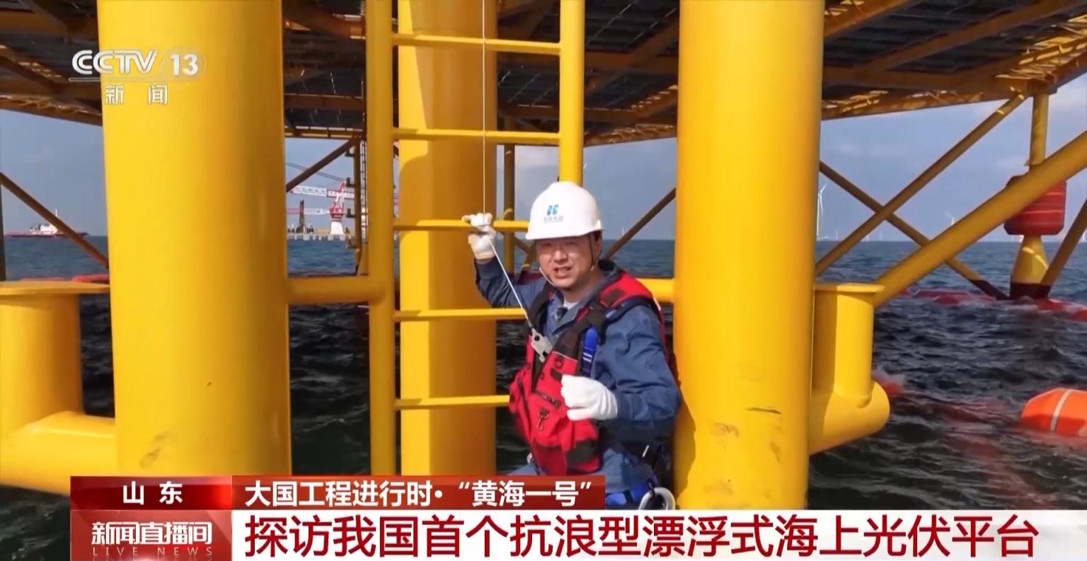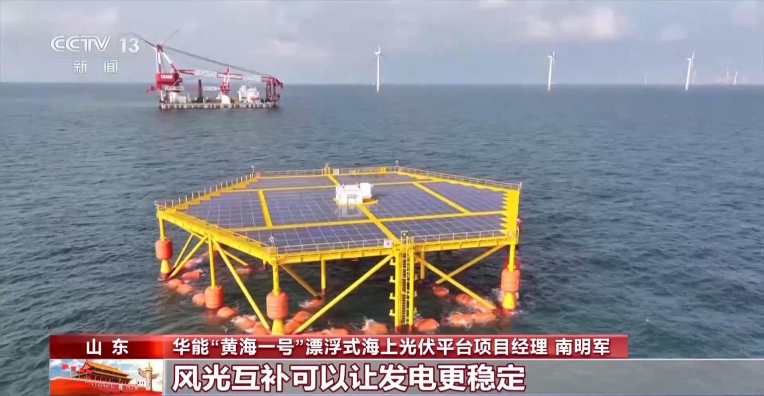 总台央视记者 古峻岭:我们可以看到黄海一号这个光伏平台的作业区域,是位于山东半岛华能的海阳风电场。周边有很多风电机组,这个光伏平台和这些风电机组共享电缆。这种风电和光伏互补的模式,可以更好地确保电网的稳定和安全。