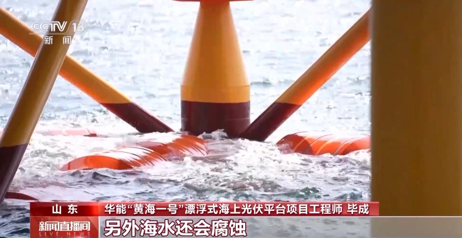 华能黄海一号漂浮式海上光伏平台项目工程师 毕成:因为海浪接触到光伏板之后,会产生盐碱结晶,这样会影响我们的光电转换效率。另外海水还会腐蚀我们的光伏组件以及电气系统。因此我们整个平台是将整个高度提升,这样即使在50年一遇的海况条件下,波浪也不会接触到我们的光伏板。