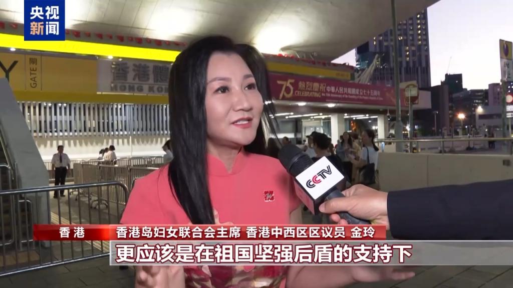 香港岛妇女联合会主席、香港中西区区议员 金玲:我们作为香港人,更应该是在祖国坚强后盾的支持下发挥我们香港一国两制、背靠祖国、联通世界的独特优势。我们要满怀信心展现更大的、新的作为。祝福祖国繁荣昌盛,国泰民安,也相信我们香港一定会创造更加美好的未来。