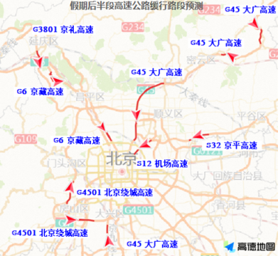 预计10月5日至7日,京藏、京承、机场、京港澳、京开、京沪、京哈等通往郊区和周边省市的主要高速公路,进京方向车流将明显增加。14至19时,京藏、京承、京港澳、京沪、京开、机场等高速进京方向的交通压力将有所增加,京藏高速康庄、居庸关、西三旗、北沙滩,京承高速黄港、太阳宫,京港澳高速琉璃河、西道口,京开高速玉泉营、新发地、榆垡等路段都是进京方向车流集中的点段。