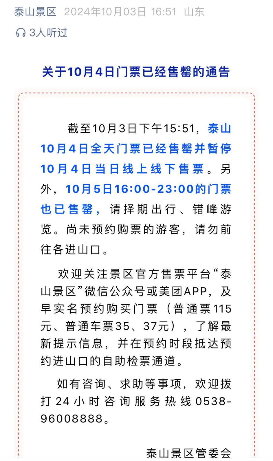此前,山东泰山景区管委会10月3日发文称,截至10月3日15点51分,泰山10月4日全天门票已经售罄并暂停10月4日当日线上线下售票。另外,10月5日16:00-23:00的门票也已售罄,请择期出行、错峰游览。尚未预约购票的游客,请勿前往各进山口。