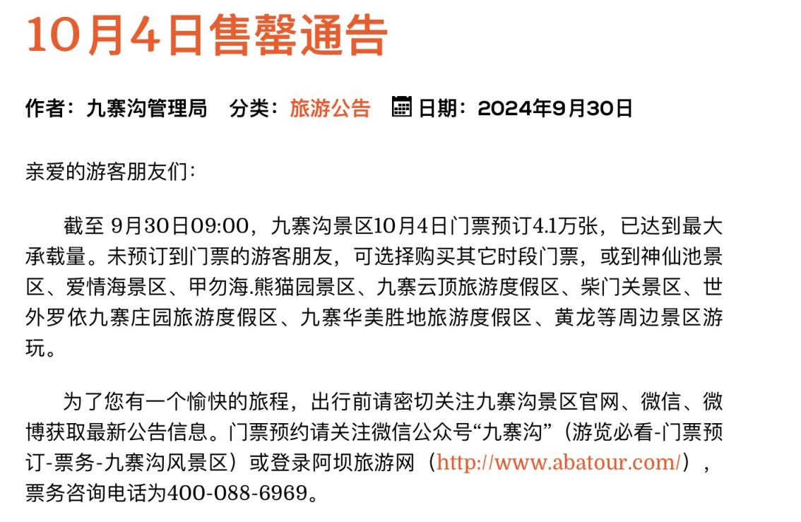 9月30日,九寨沟景区管理局发布的《售罄通告》,截至 9月30日09:00,九寨沟景区10月4日门票预订4.1万张,已达到最大承载量。未预订到门票的游客朋友,可选择购买其它时段的门票等。