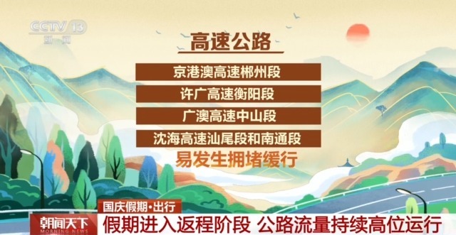 预计高速公路易发生拥堵缓行路段主要为京港澳高速郴州段、许广高速衡阳段、广澳高速中山段、沈海高速汕尾段和南通段等。易发生拥堵的时段为9时至11时和16时至19时。