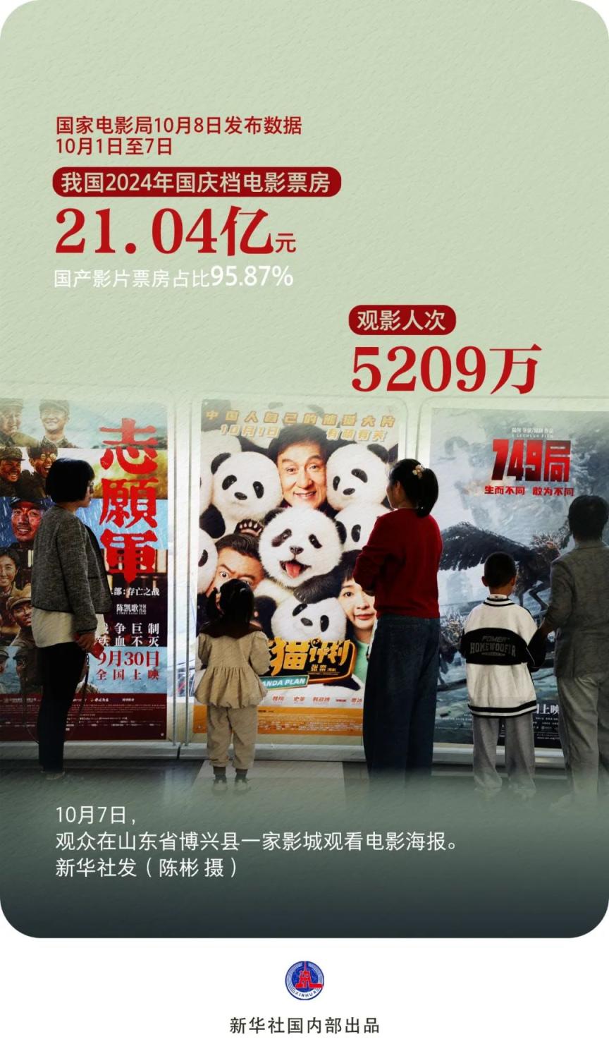 国家电影局10月8日发布数据,2024年国庆档,我国电影票房为21.04亿元,观影人次为5209万。其中,国产影片票房为20.17亿元,占比为95.87%。