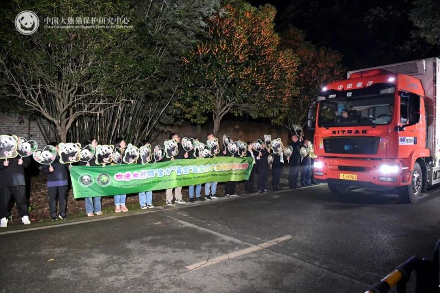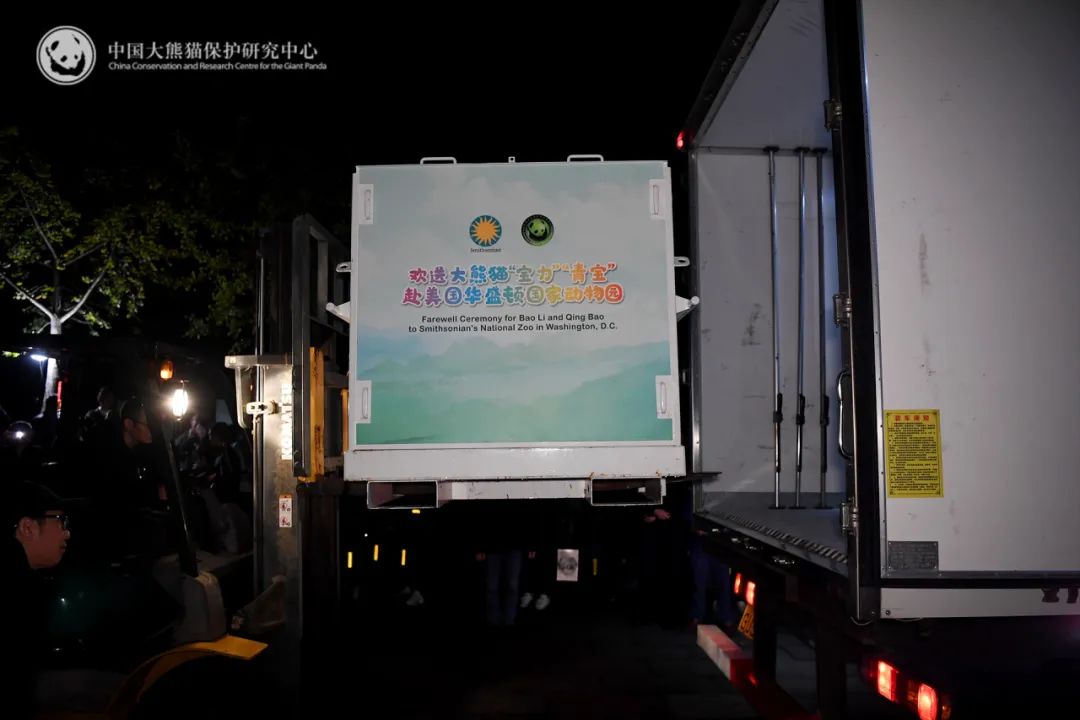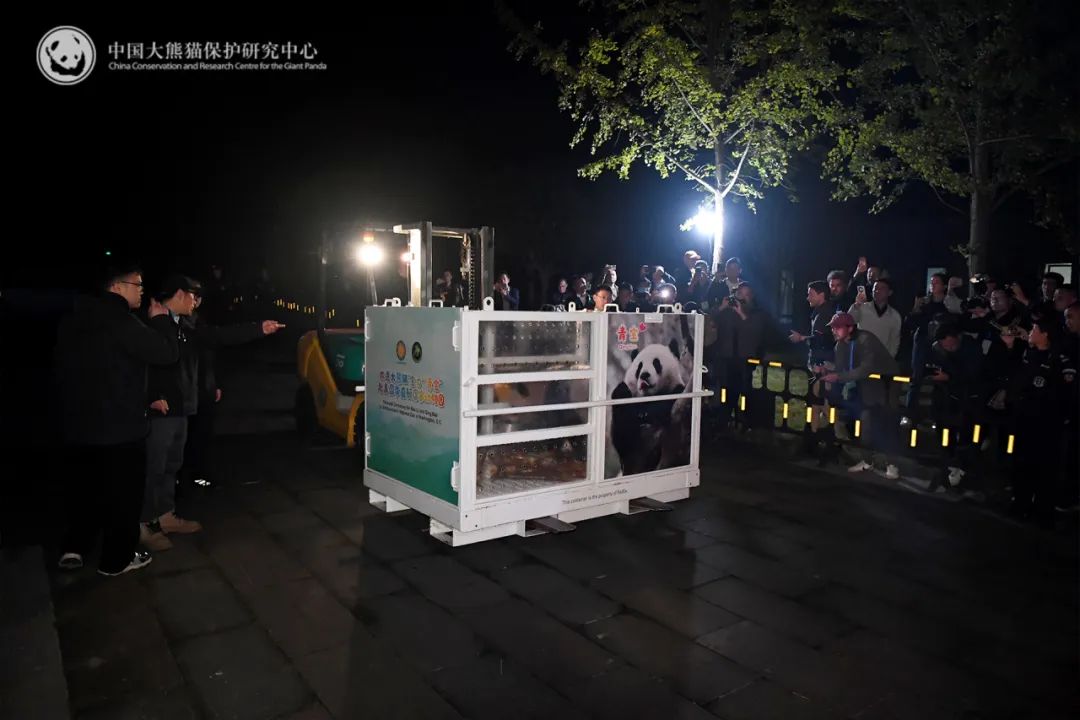 10月14日晚,大熊猫宝力青宝乘坐专车离开中国大熊猫保护研究中心都江堰基地前往成都双流国际机场,将于15日搭乘专机前往美国华盛顿国家动物园,开启为期10年的旅居生活。