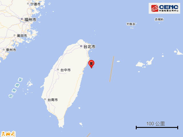 据中国地震台网正式测定,10月14日21时17分在台湾花莲县海域发生4.1级地震,震源深度28公里,震中位于北纬24.18度,东经121.96度,距台湾岛约23公里。