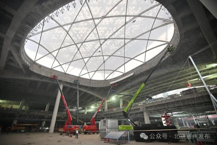 目前,副中心站综合交通枢纽主体结构封顶,装修完成过半,帆屋盖主帆钢结构实现封顶,首片主帆泡泡采光顶安装完成,整体形象已经亮相。今年年底,枢纽装修、设备安装将完成80%。