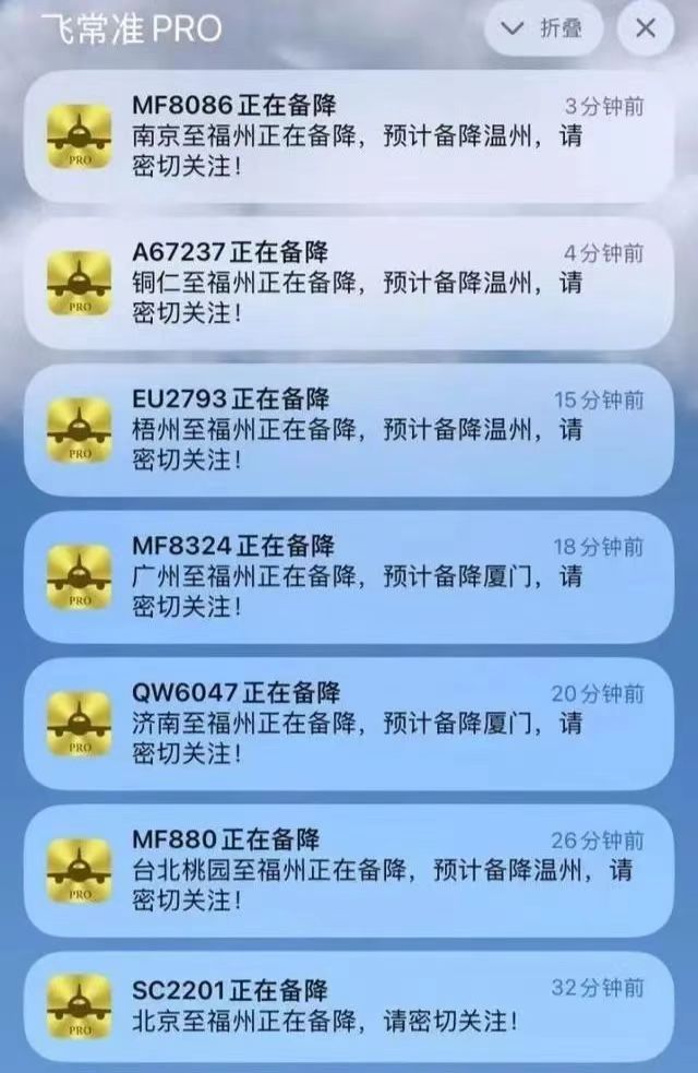 今天(10月21日)下午,多架从无锡、大连、北京等地飞往福州长乐国际机场的航班在空中盘旋后,备降至附近的温州机场和厦门机场。