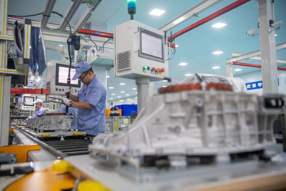 在重庆青山工业有限责任公司车间内,工人在生产线上作业。新华社记者唐奕 摄