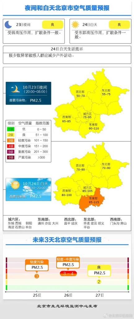 10月24日白天,受东部高压作用,扩散条件一般,预计首要污染物为PM2.5,空气质量指数80-100,2级,良。预计25日:3级;26日:3-4级;27日:2级。具体分区预报结果见附表。