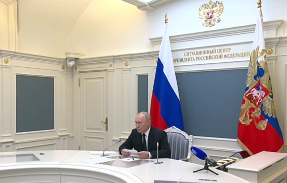当地时间10月29日,俄罗斯总统普京在莫斯科克里姆林宫通过视频连线的方式出席俄军战略核力量演习。