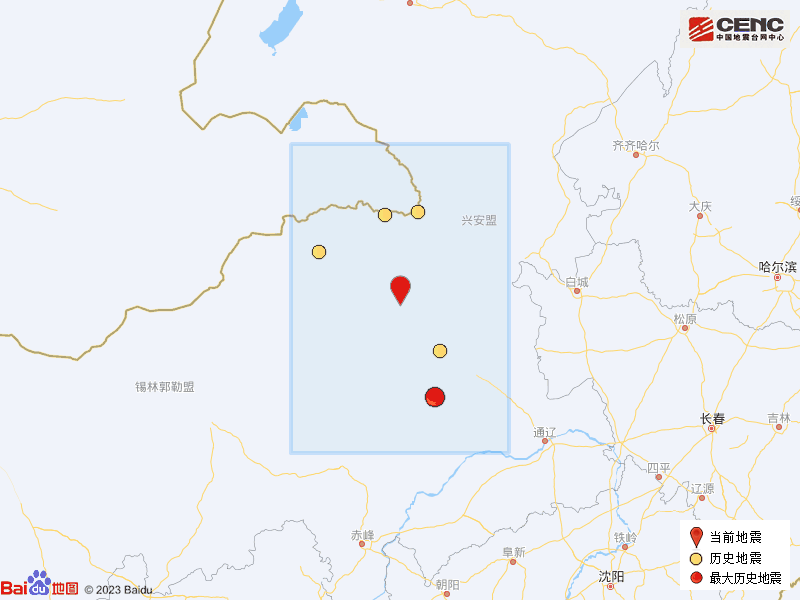 历史地震:根据中国地震台网速报目录,震中周边200公里内近5年来发生3级以上地震共6次,最大地震是2021年10月15日在内蒙古赤峰市阿鲁科尔沁旗发生的4.7级地震(距离本次震中156公里),历史地震分布如图。