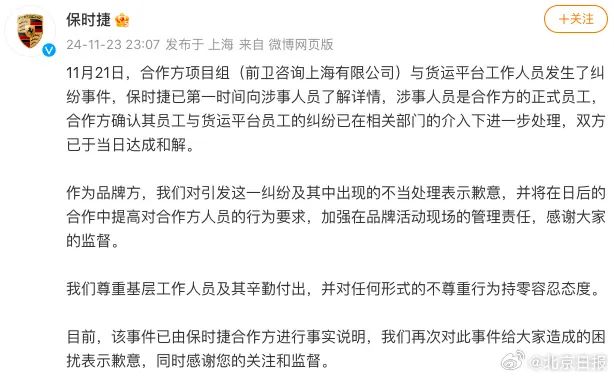 保时捷在声明中称:11月21日,合作方项目组(前卫咨询上海有限公司)与货运平台工作人员发生了纠纷事件,保时捷已第一时间向涉事人员了解详情,涉事人员是合作方的正式员工,合作方确认其员工与货运平台员工的纠纷已在相关部门的介入下进一步处理,双方已于当日达成和解。