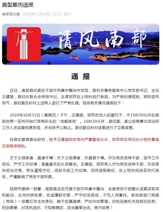 南部县纪委通报,近日,南部县纪委在干部作风集中整治中发现,县机关事务服务中心党支部书记、主任王建国,县妇女联合会党组书记、主席郑苏在上班时间打麻将。为严明纪律规矩、狠刹歪风邪气,县纪委及时对上述两人进行了严肃处理。现将有关情况通报如下: