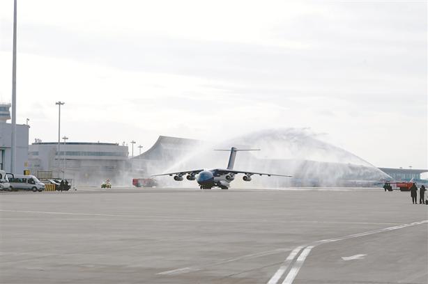 图为11月28日,接运第十一批在韩志愿军烈士遗骸回国的运-20专机缓缓穿过代表着最高礼遇的水门。 瞿芃 摄