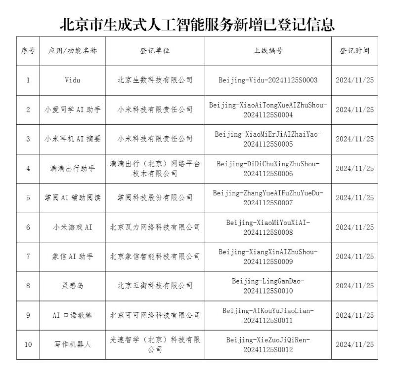 北京市生成式人工智能服务已登记信息公告(12月2日)