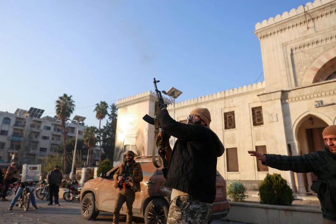 ▲12月6日,进入哈马的叙利亚反政府武装人员对天鸣枪。(法新社)