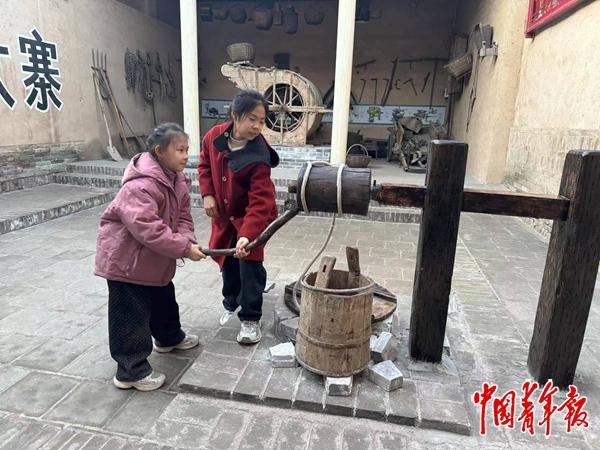 在山西省河津市西磑村古堡内,小朋友们正在了解水井的打水方法。