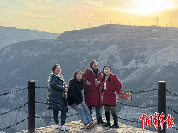 随着一阵敲锣打鼓声,一支由14人组成的金龙队伍开始傍山而行,引领游客历经垂直高度达300米、长度约2000米的征程,直达龙门之巅天上龙门观景台。登天梯的过程中,随处可见举着自拍杆直播的网红主播和操着外地口音的游客。张悦跟一名来自广东的游客攀谈起来,才知道他们的孩子很喜欢《黑神话:悟空》游戏,今年春节特地来山西旅游。河津龙门是他们旅游的第一站,住在县城宾馆,同样是乘坐公交车而来。