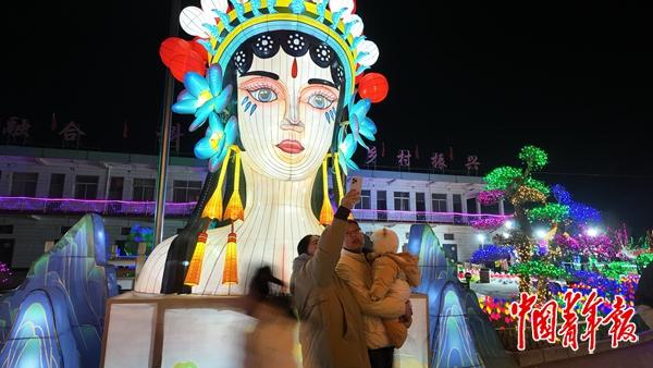 山西省河津市航天牡丹园举办迎春灯展,一家三口正在戏剧人偶灯前合影留念。