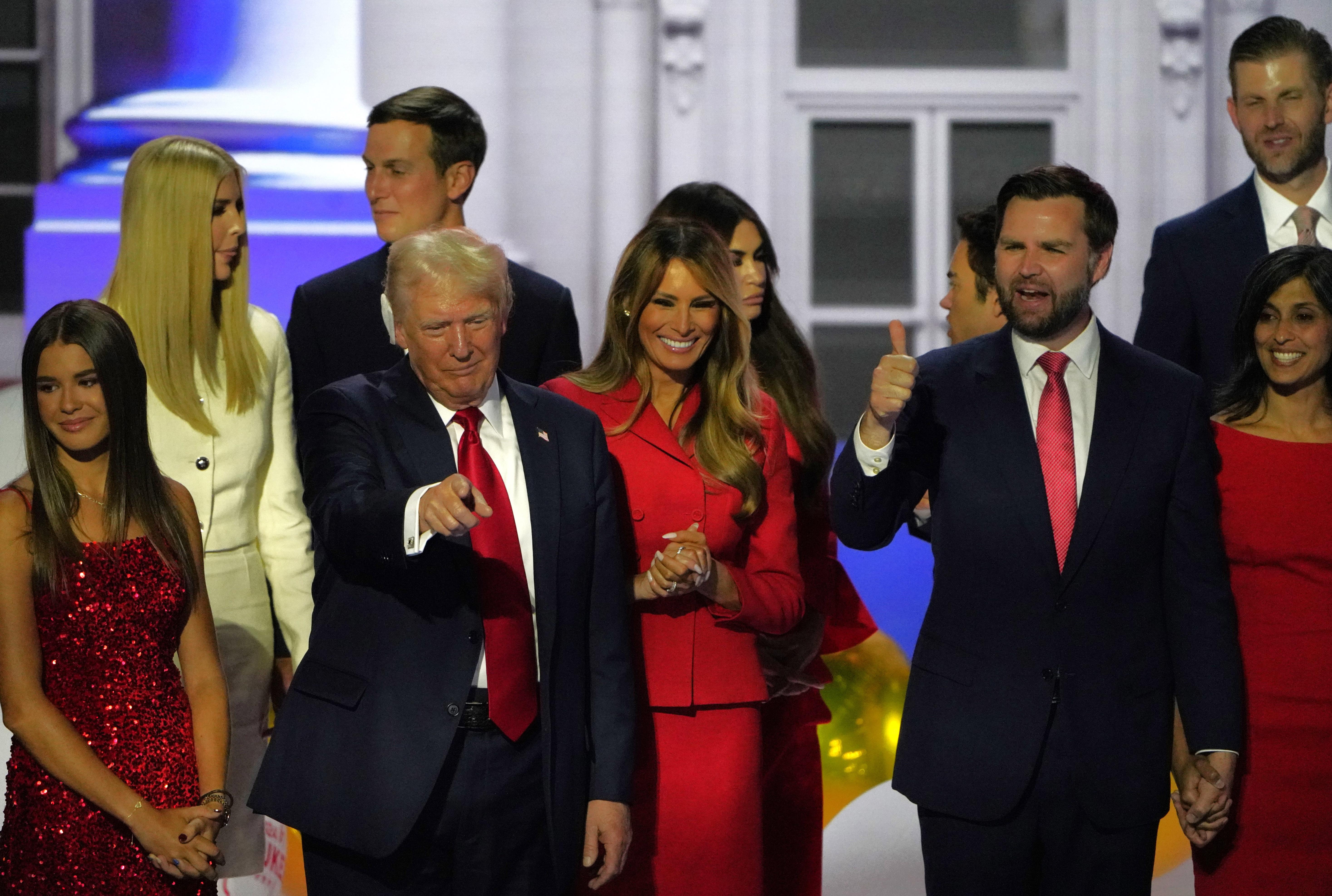 图为万斯(前排右二)2024年7月18日与特朗普(前排左二)在美国威斯康星州密尔沃基市参加共和党全国代表大会的资料照片。新华社记者吴晓凌摄