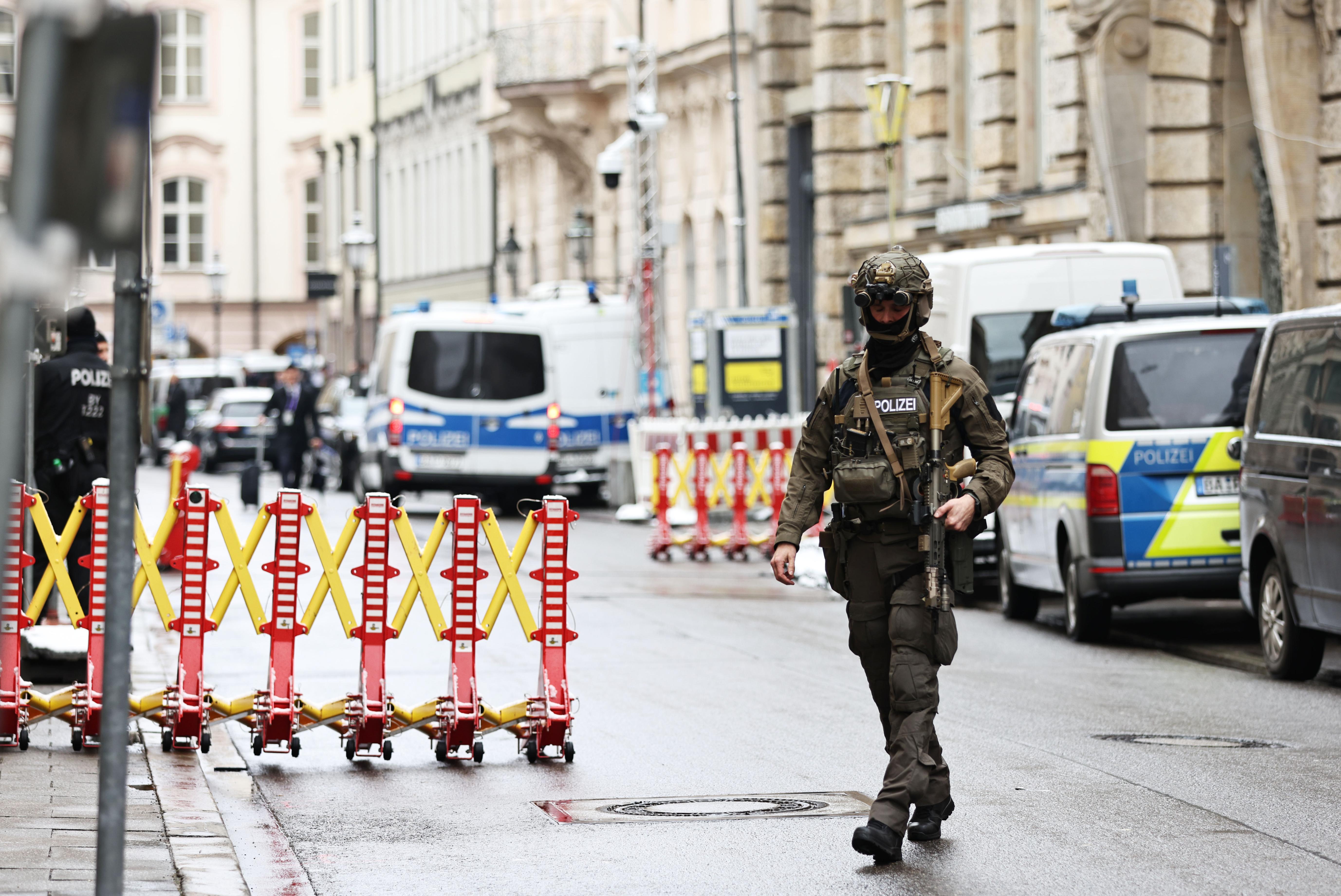 2月14日,警察在德国慕尼黑安全会议主会场外警戒。新华社记者高静摄